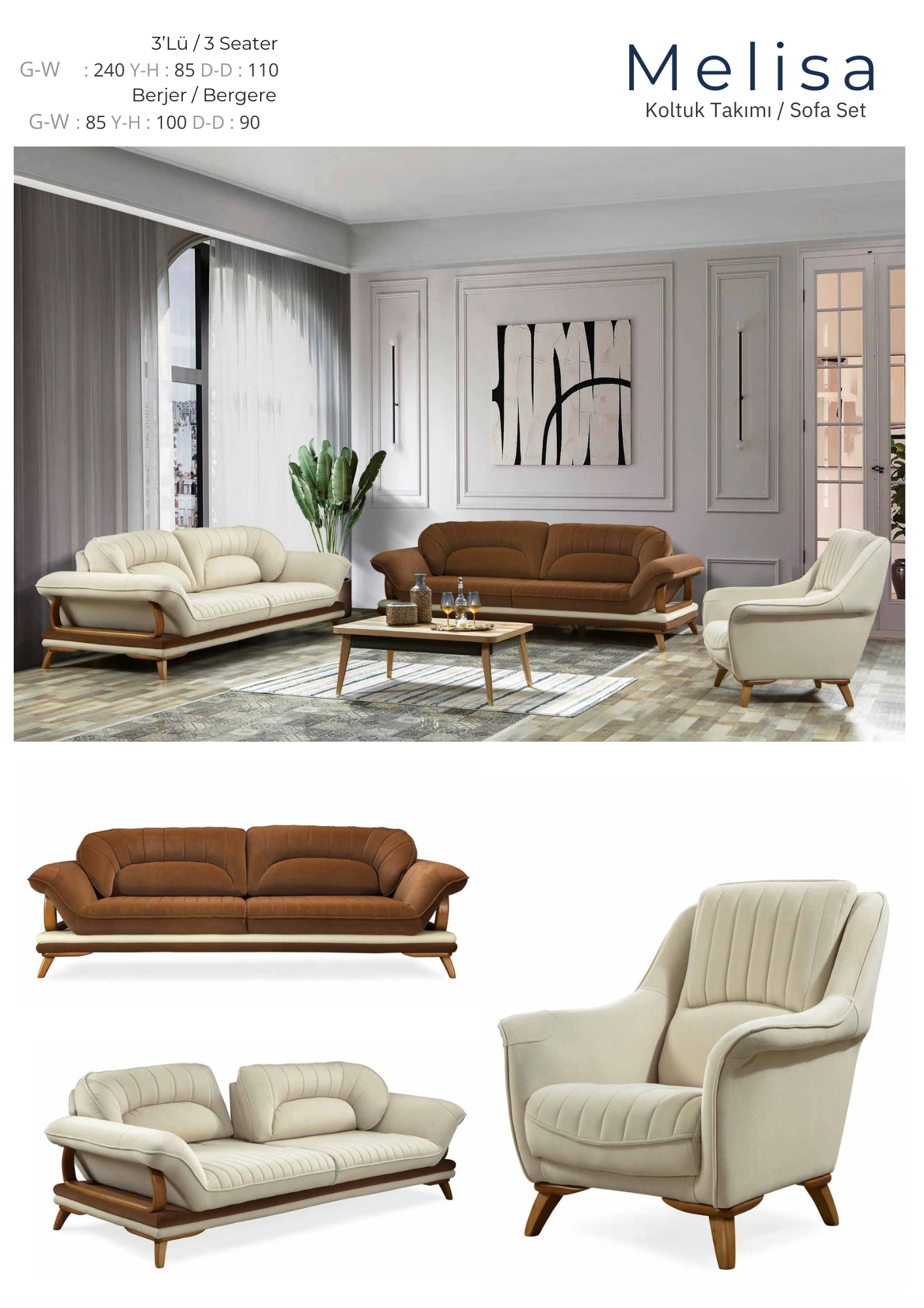3’Lü / 3 Seater Berjer / Bergere G-W G-W : 240 Y-H : 80 D-D : 100 : 80 Y-H : 90 D-D : 90